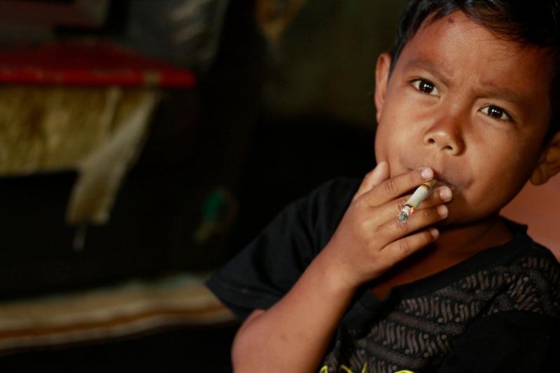 طفل بريء يحمل سيجارة مشتعلة يكاد طولها يتجاوز أطوال اصابع يديه الندية، يضعها في فمه ويرشف منها، ثم ينفث الدخان من فمه وانفه معا، فتتكون سحابة رعناء تلفه ومن حوله.