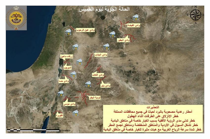 ونوه الى ارتفاع منسوب المياه في محاور الطرق الرئيسية والأنفاق في المدن الأردنية بما فيها العاصمة عمان، وتدني مدى الرؤية الأفقية على الطرق الصحراوية الدولية بفعل الغبار والأتربة المثارة، وكذلك تشكل الضباب والغيوم الملامسة لسطح الأرض في الطرق الجبلية.