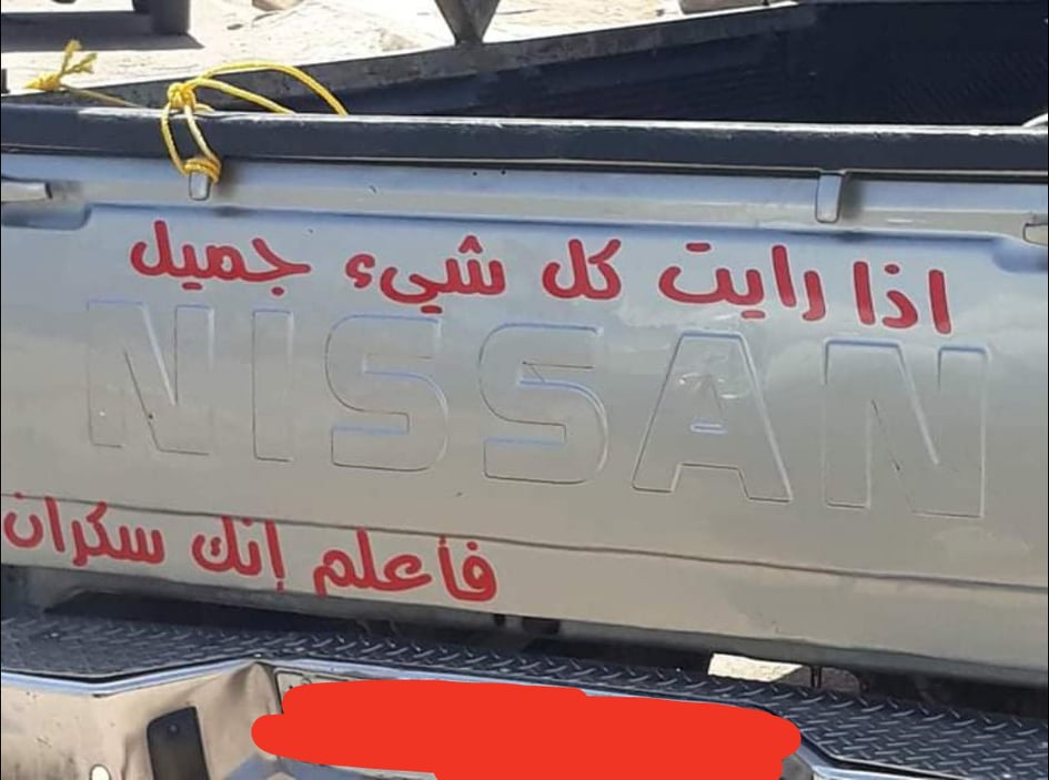وفي التفاصيل، كتب مواطن اردني عبارة 'اذا رأيت كل شيء جميل فاعلم انك سكران' والتي تلقاها البعض بنوع من السخرية والفكاهة ،إلا ان البعض الآخر اكد انها تعكس مدى المعاناة التي يعيشها صاحب المركبة، وقد اعتبر العبارة وسيلة تعبيرية لما ياني منه.