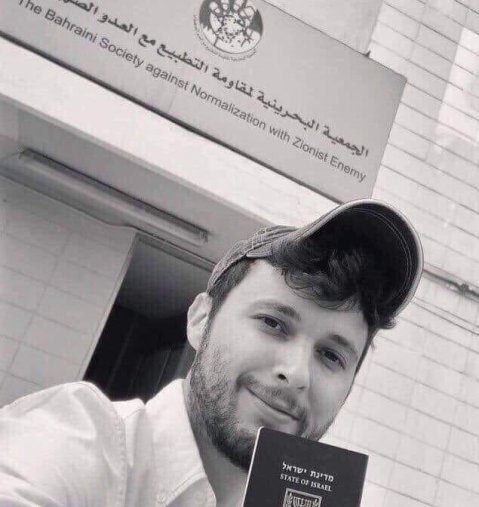 تناقلت مواقع التواصل الاجتماعي صورة لصحفي إسرائيلي يظهر فيها وهو يحمل جواز سفره أمام "الجمعية البحرينة لمكافحة التطبيع مع العدو الصهيوني" في المنامة.
