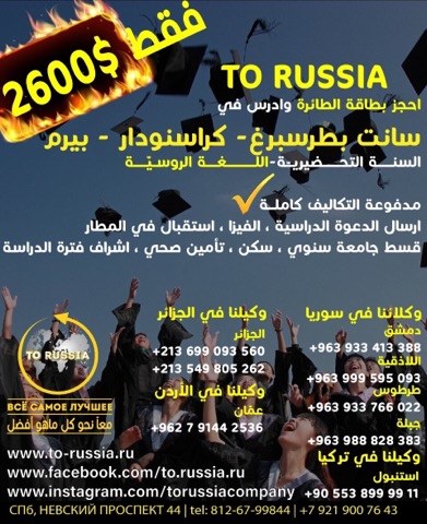 سعر قسط السنة التحضيري في جميع الجامعات في سانت بطرس بورغ يتراوح ما بين ال 2000 –3500 $