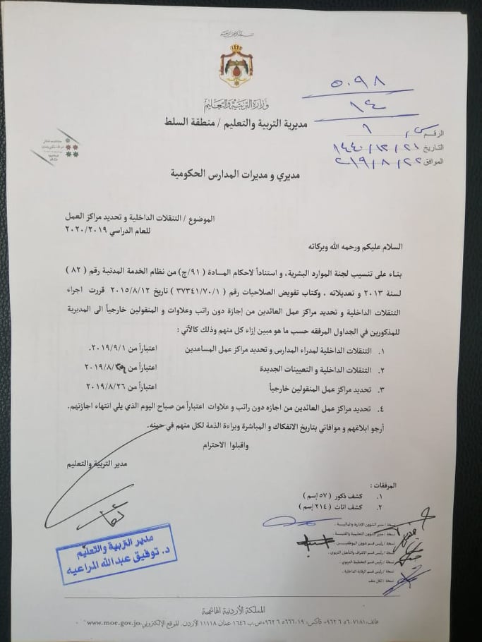 قرر مدير التربية والتعليم لمنطقة السلط الدكتور توفيق المراعية اجراء التنقلات التالية :