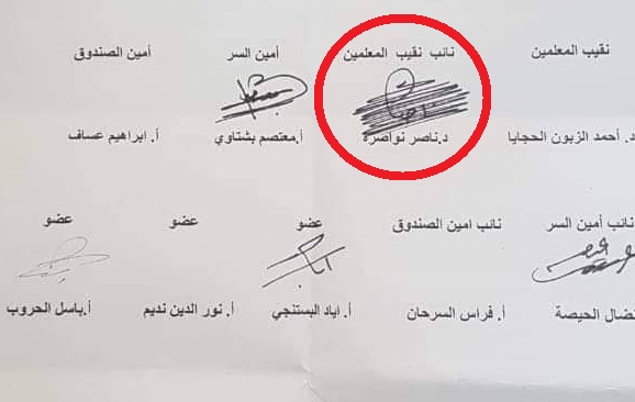 اجتاحت صورة لتوقيع الدكتور ناصر النواصرة نائب نقيب المعلمين الأردنيين ، مواقع التواصل الاجتماعي وتم تداولها ونشرها بشكل واسع منذ مساء امس الخميس .