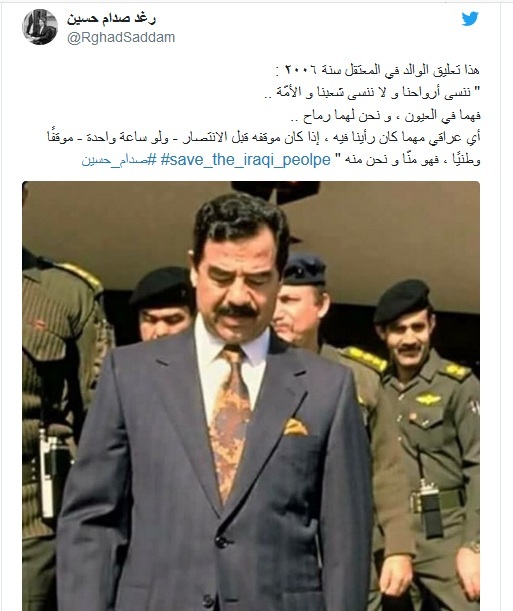 كما نشرت ابنة الرئيس العراقي الراحل في تغريدة أخرى نص ما قالت إنه تعليق الوالد في المعتقل سنة ٢٠٠٦: "ننسى أرواحنا و لا ننسى شعبنا و الأمّة .. فهما في العيون ، و نحن لهما رماح .. أي عراقي مهما كان رأينا فيه ، إذا كان موقفه قبل الانتصار – ولو ساعة واحدة – موقفًا وطنيًا ، فهو منّا و نحن منه”