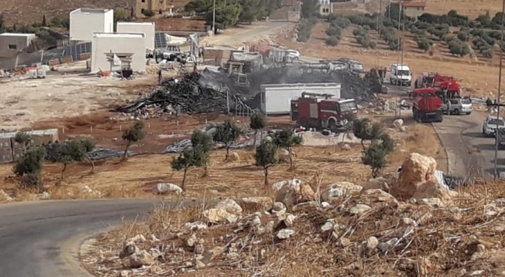 وبين المصدر أن مشروع الطاقة الشمسية قيد التجهيز ويقع على مساحة ٩٥ دونم وأن الحريق انحصر في منطقة المستودع فقط .