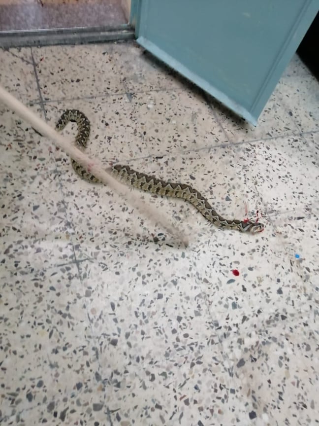 تمكنت المعلمة سهام عبد الرحيم عبد الله الجدوع من مدرسة اليرموك الاساسية صباح اليوم الاحد من قتل افعى سامة داخل احدى الغرف الصفية