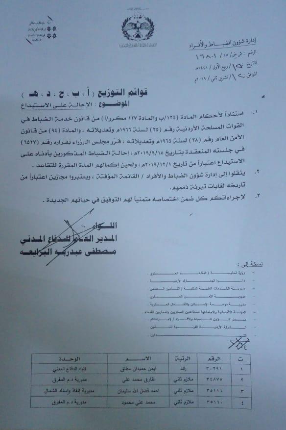 قرر مجلس الوزراء في جلسته المنعقده بتاريخ 18/9/2019 ، احالة الضباط المذكورين ادناه على الاستيداع اعتبارا من 1/12/2019 ولحين اكمالهم المدة المقررة للتقاعد :.