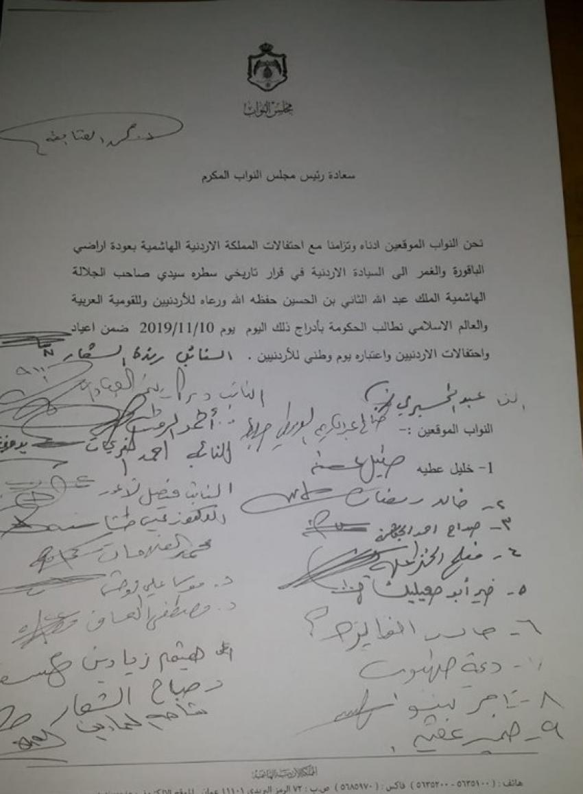 تبنى النائب خليل عطية مذكرة نيابية وقع عليها عدد كبير من النواب تطالب باعتبار يوم استعادة اراضي الباقورة والغمر يوما وطنيا.