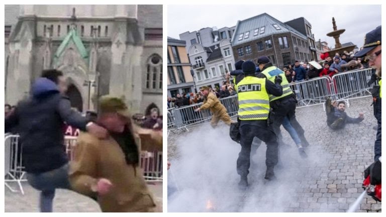 – لم يتحمل لاجئ سوري في النرويج مشهد رجل متطرف وهو يحرق القرآن امام جمع من انصاره المتطرفين، وقام بمنع هذا التصرف بطريقته الخاصة، في فيدو غنتشر بشكل كبير على منصات وسائل التواصل الإجتماعي المختلفة.