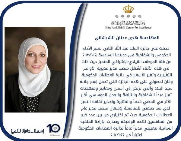 يذكر أيضا أن المهندسة هدى الشيشاني ، مهندسة حاصلة على جائزة الملك عبدالله الثاني لتميز الأداء الحكومي والشفافية ، وحاصلة على الحماية القانونية بعد ادلائها بشهادتها أمام هيئة النزاهة ومكافحة الفساد، إذ اشتملت الشهادة على معلومات على قدر عال من الأهمية، أدت إلى إلغاء عطاء كانت تزيد قيمته بحوالي 40 مليون دينار أردني عن الكلفة التقديرية، الأمر الذي جنب خزينة الدولة هذه الخسارة .
