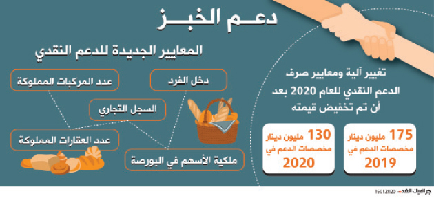 وبين المصدر الذي فضل عدم كشف هويته أن المعايير الجديدة سوف تستثني على الأغلب من يمتلك سجل تجاريا (نشاط تجاري) من الحصول على الدعم إذ كانت تصل شكاوى حول حصول بعض المواطنين من أصحاب شركات ومحال تجارية تدر عليهم دخلا كبيرا على الدعم الذي تبلغ قيمته 27 دينارا للفرد من غير المشمولين بالمعونة الوطنية.