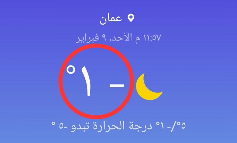 تُسجّل محطات الرصد الجوي درجات حرارة مُتدنية للغاية في العديد من المناطق في الأردن و بذلك بحسب القراءات المُسجّلة الساعة 11:00 ليلاً من يوم الأحد 9-2-2020. و سجّلت بعض محطات أحياء العاصمة عمان مثل تلك التي في شمال العاصمة درجات حرارة مُتدنية وصلت إلى -2 مئوية تحت الصفر. كما سجّلت كل من محطتي الرشادية في محافظة الطفيلة و القاعدة في محافظة عجلون حوالي -2.5 مئوية تحت الصفر. في حين سجلت محطة الصرد في مدينة العقبة 12 درجة مئوية فوق الصفر لتكون بذلك الأعلى في المملكة.