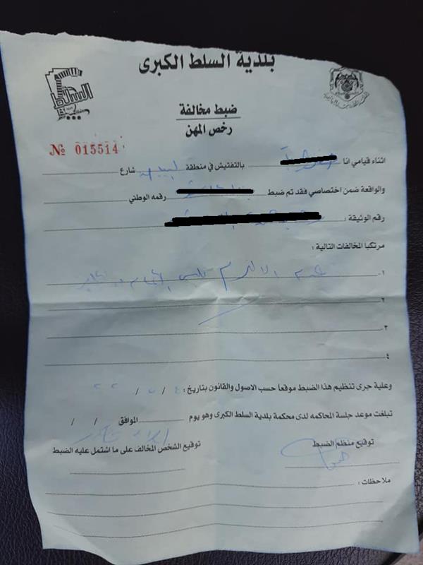 قامت الكوادر الرقابية في بلدية السلط الكبرى بتحرير مخالفة لاحد المحال التجارية في المدينة بسبب عدم الالتزام بلبس الكمامة ، وبحسب المخالفة التي تداولها ناشطون عبر موقع التواصل الاجتماعي الفيسبوك"ولم يتسنى التاكد من صحة ورقة المخالفة"،فان المخالفة كانت قبل عدة ايام وهي قد تكون اول مخالفة لعدم لبس الكمامة في الاردن منذ اعلان قرار الدفاع الخاص بلبس الكمامة والقفازات في جميع المنشات التجارية المختلفة.