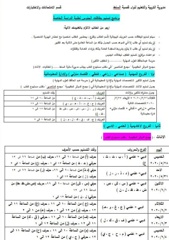 اعلنت مديرية التربية والتعليم لمنطقة السلط عن اسماء اماكن توزيع بطاقات الجلوس لطلبة الثانتوية العامة :