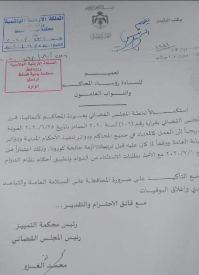 :قرر رئيس المجلس القضائي ؛رئيس محكمة التمييز القاضي محمد الغزو عودة العمل تدريجيا الى العمل كالمعتاد في جميع المحاكم ودوائر تنفيذ الاحكام المدنية ودوائر النيابة العامو وفقا لما كان عليه قبل ترتيبات ازومة جائحة كورونا وذلك اعتبارا من تاريخ ١ / ٧ /٢٠٢٠ مع الاخذ بطلبات الاستثناء من الدوام .