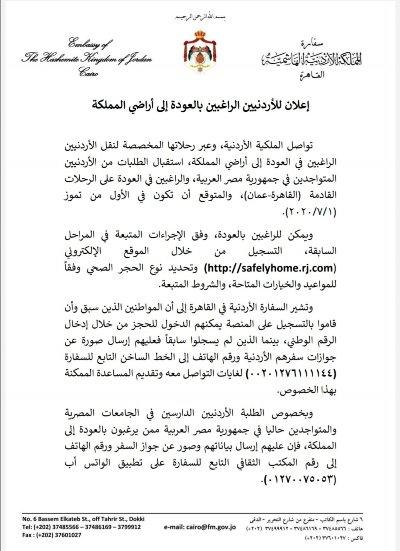 :أعلنت السفارة الأردنية في مصر بدء عملية الحجز على رحلات المرحلة الرابعة للأردنيين الراغبين بالعودة إلى المملكة، ممن سجلوا في المراحل السابقة.