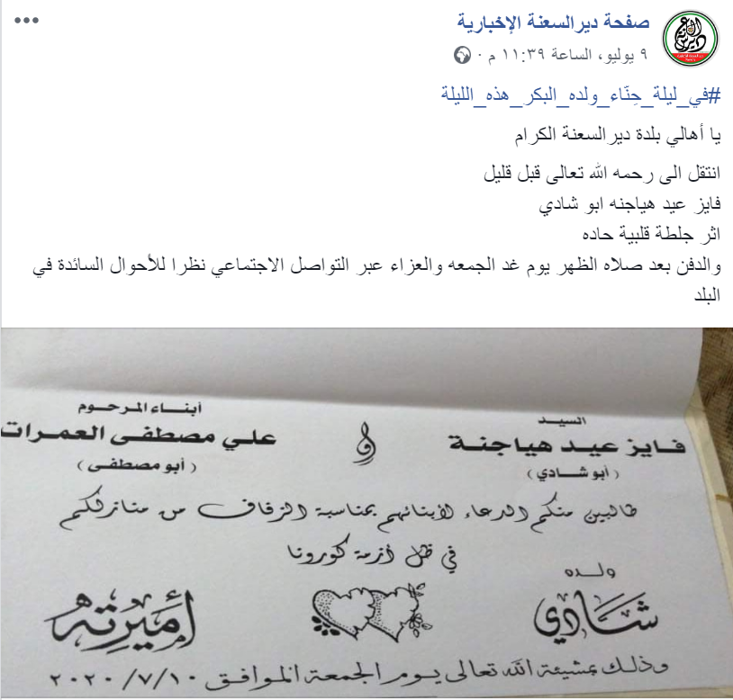 نشرت صفحة بلدة دير السعنة على الفيسبوك ، خبرا حول وفاة والد عريس اول أمس الخميس والتي كانت ليلة الحناء لابنه البكر.