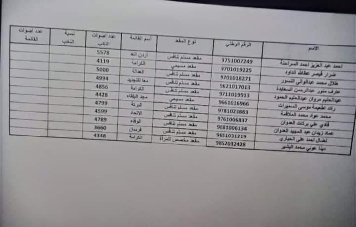 حصلت " البلقاء اليوم " على النتائج الاولية والنهائية لانتخابات المجلس النيابي التاسع عشر في محافظة البلقاء