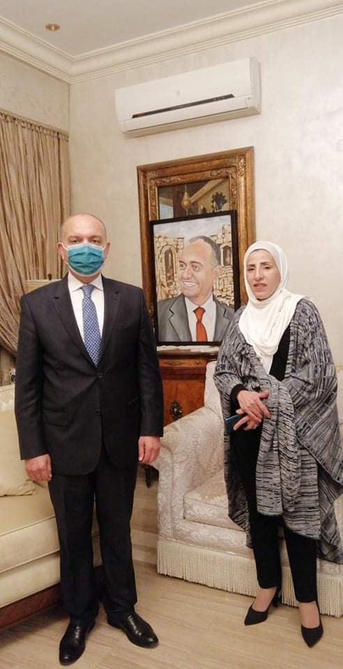 - اهدت سفيرة الفن التشكيلية الاردنية ولاء حياصات سفير الاردن لدى مصر معالي أمجد العضايلة. لوحة فنية رفيعة المستوى تليق بصاحب اللوحة وشخصيتها مثلما تليق بمكانة الفنانة المميزة التي فرضت حضورها على المشهد الفني والسياسي كونها تهتم بالقضايا الوطنية والقومية والانفعالات الجارية وتعبر عنها وتجسدها من خلال الريشة والذوق وتلاقيها الرفيع .