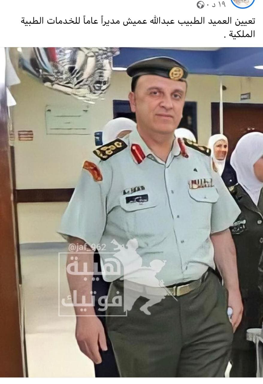 :اكدت مصادر أن قراراً صدر بتعيين العميد الطبيب عبدالله عميش مديراً عاماً للخدمات الطبية الملكية، بدلا من العميد الطبيب عادل الوهادنة الذي تم تعيينه مستشاراً لرئيس هيئة الاركان.
