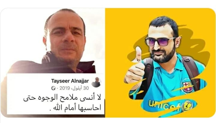 “ومات تيسير النجار! صحفي عنبر 9 مات! حمل غصته إلى الله محتفظا بوجوه ظالميه، مات! هكذا بكل بساطة رحل إلى ربِّه، مظلوما، كسيرا، كظيما، مصادر الحق في أن يشتكي بمن ظلمه، وأن يبوح بحكايات ظالميه وجهنم التي يخبئونها عن العالم، بوفاتك لقد خسر العالم القبيح قلبا جميلا يا صديقي”.