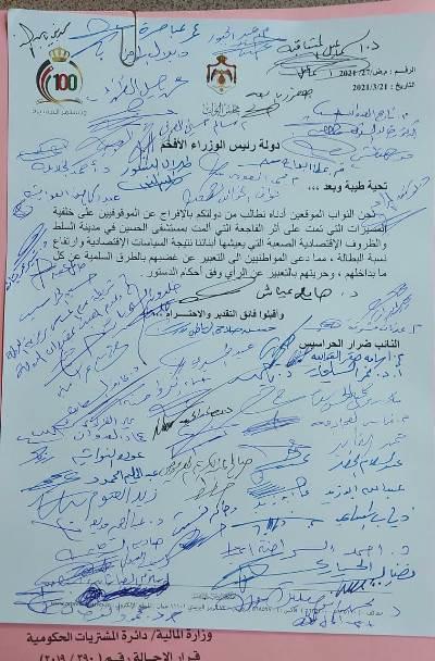 تقدم النائب ضرار الحراسيس بمذكر ة لرئيس الوزراء بشر الخصاونة بضرورة الإفراج عن جميع الموقوفين على خلفية الاحتجاجات السلمية التي تبعت حادثة مستشفى السلط