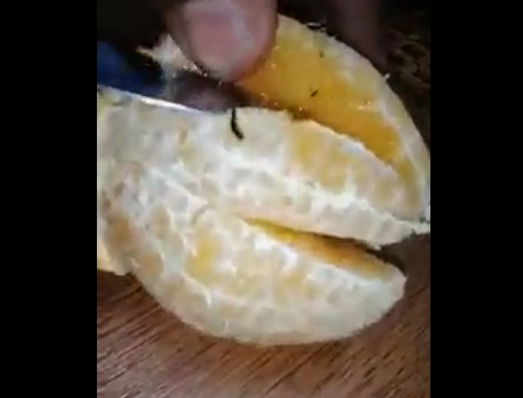 تداول ناشطون عبر مواقع التواصل الاجتماعي فيديو يوضح وجود ديدان سوداء وبيوضها داخل ثمار برتقال ابو صرة المستورد .