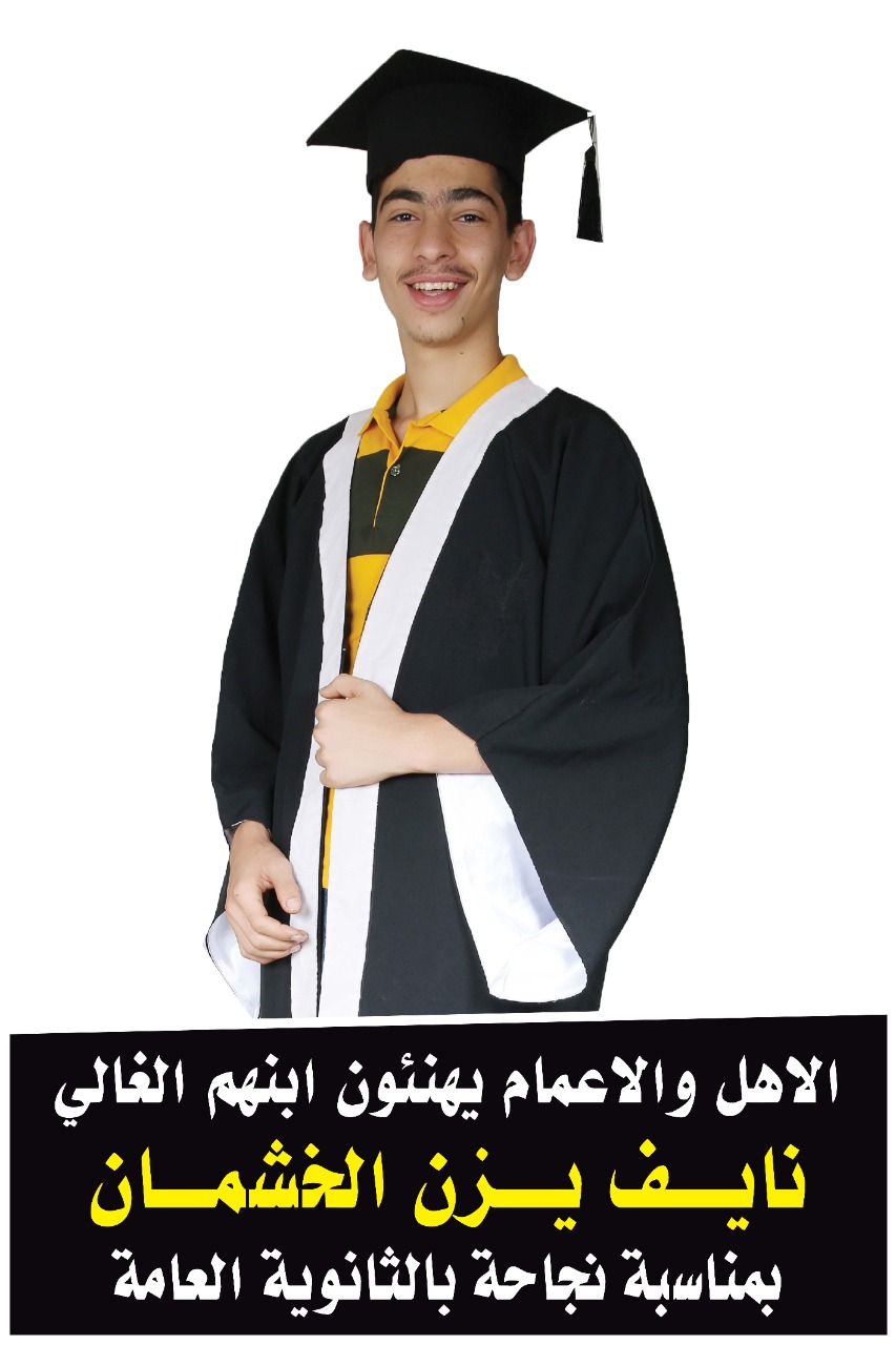 بنجاحه بالثانويه العامه وحصوله على معدل ٨٠،٤ واطلب من الله العلي القدير التقدم والازدهار في حياته الدراسيه والعملية.. مقدمه من خلال جده نايف علي الخشمان