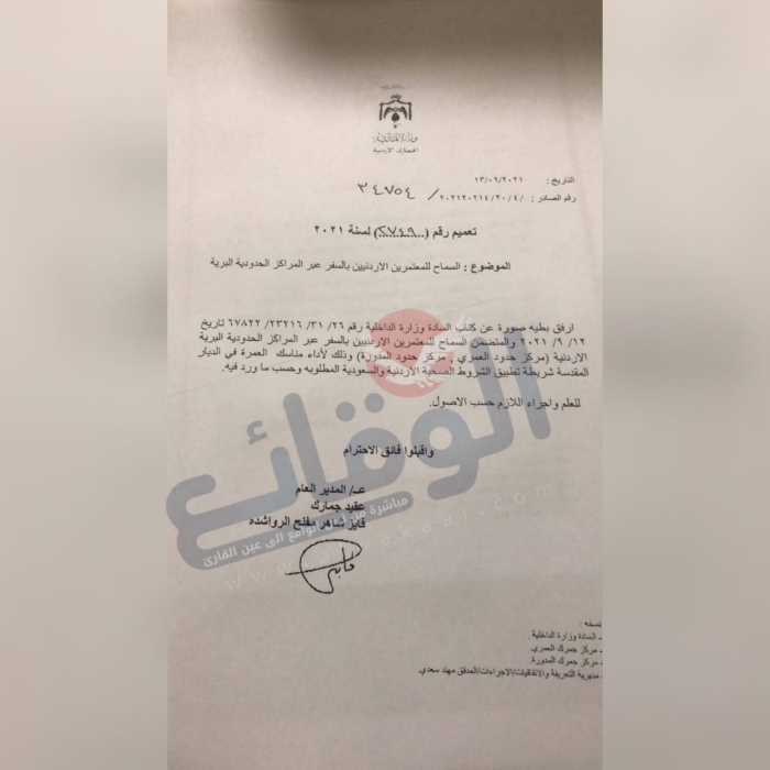قررت وزارة الداخلية السماح للمعتمرين الاردنيين بالسفر عبر المراكز الحدودية البرية الاردنية "مركز حدود العمري ؛ مركز حدود المدورة " وذلك لاداء مناسك العمرة في الديار المقدسة .