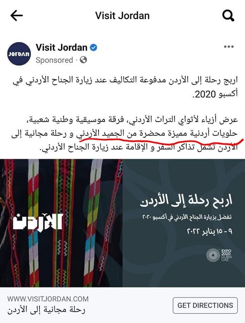 نشرت منصة "visit jordan " التابعة لوزارة السياحة عبر صفحتها الرئيسية على موقع التواصل الاجتماعي "الفيسبوك " منشور تضمن جوائز للزائرين الى الجناح الاردني في اكسبو ٢٠٢٠ .