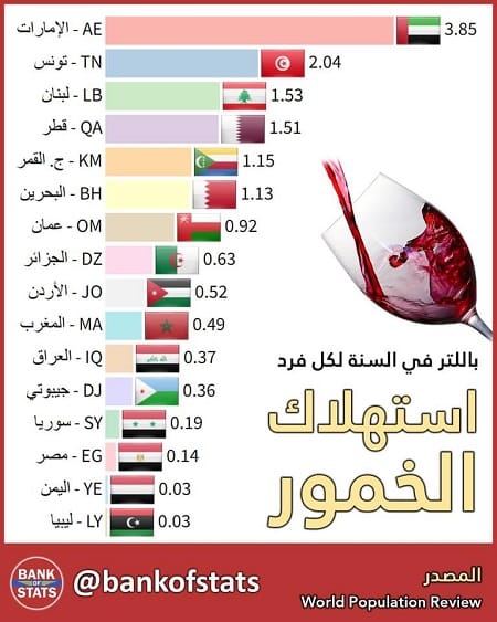حل الأردن في المرتبة التاسعة عربيا، معدل الاستهلاك المتوسط للكحول لكل فرد في السنة، وفق موقع بانك اوف ستاتس.