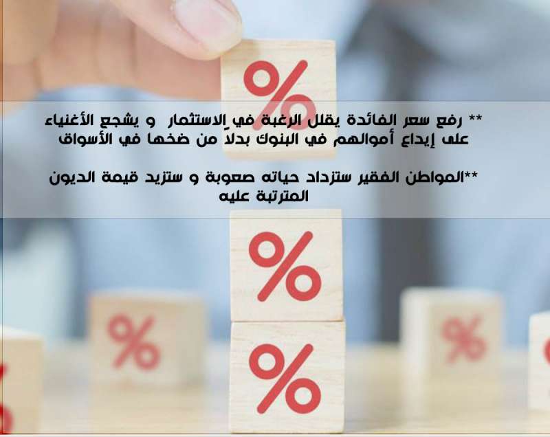 رفع سعر الفائدة يعني زيادة كلفة الاقتراض و بالتالي زيادة الأعباء على الحكومات و الافراد و المستثمرين مما يقلل الرغبة في الاستثمار و الشراء و بالتالي تراجع النشاط الاقتصادي مما يؤدي الى زيادة البطالة و تقليل النمو و سيشجع الأغنياء أصحاب رؤوس الأموال على إيداع أموالهم في البنوك للحصول على عوائد افضل بدلاً من المجازفة وضخها في الأسواق .