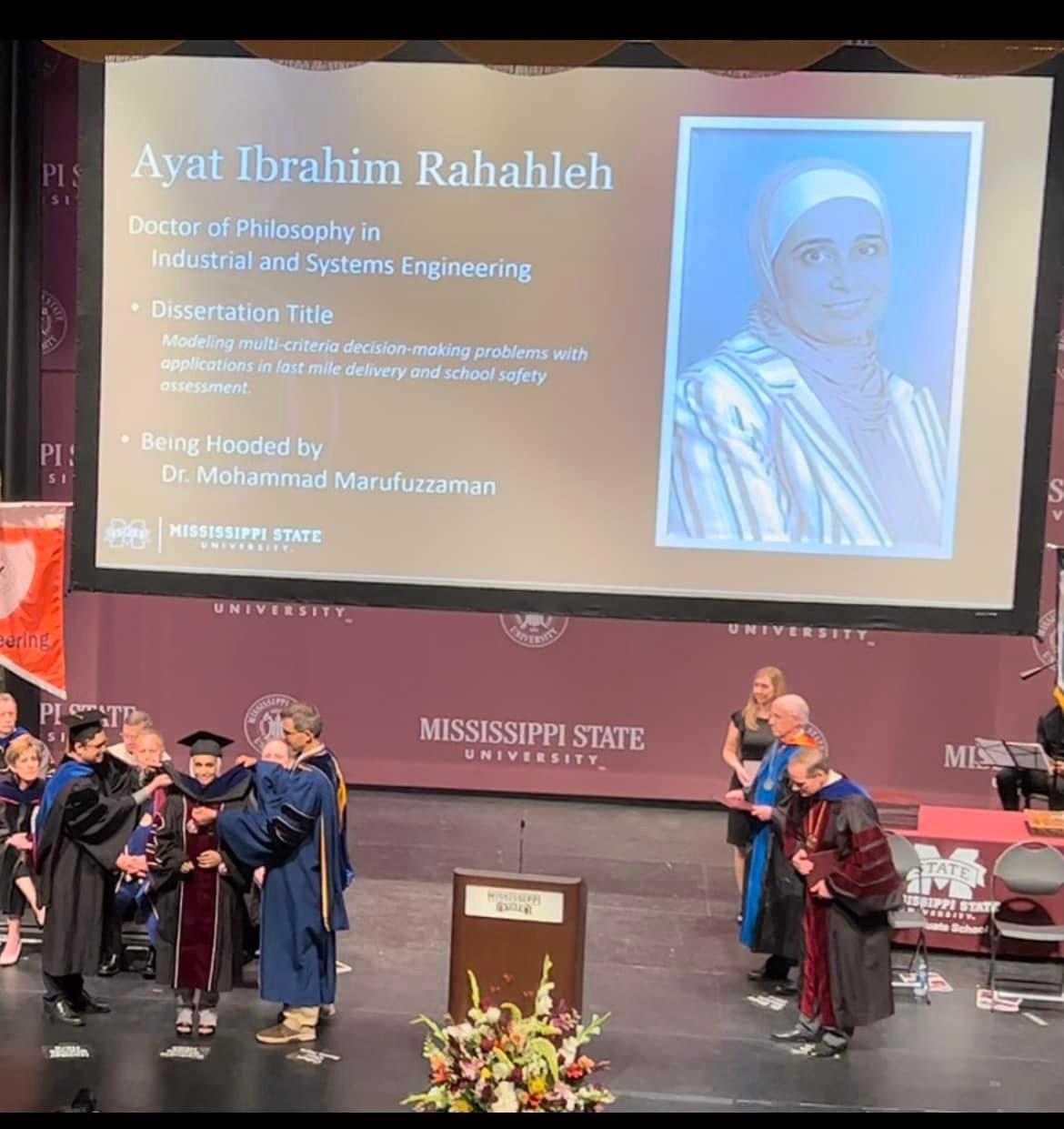 حصلت الدكتوره. آيات ابراهيم فرحان. رحاحلة على درجة الدكتوراه بالهندسة الصناعية. بامتياز من جامعة المسيسيبي