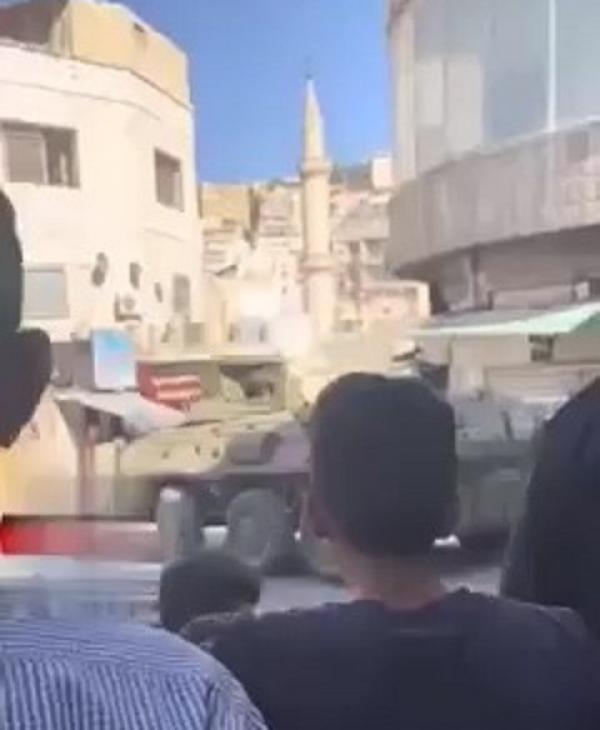 تداول ناشطون عبر مواقع التواصل الاجتماعي مقاطع فيديو تظهر دبابة وجنود في منطقة وسط البلد بالعاصمة عمّان، متسائلين عما يحدث في المكان.