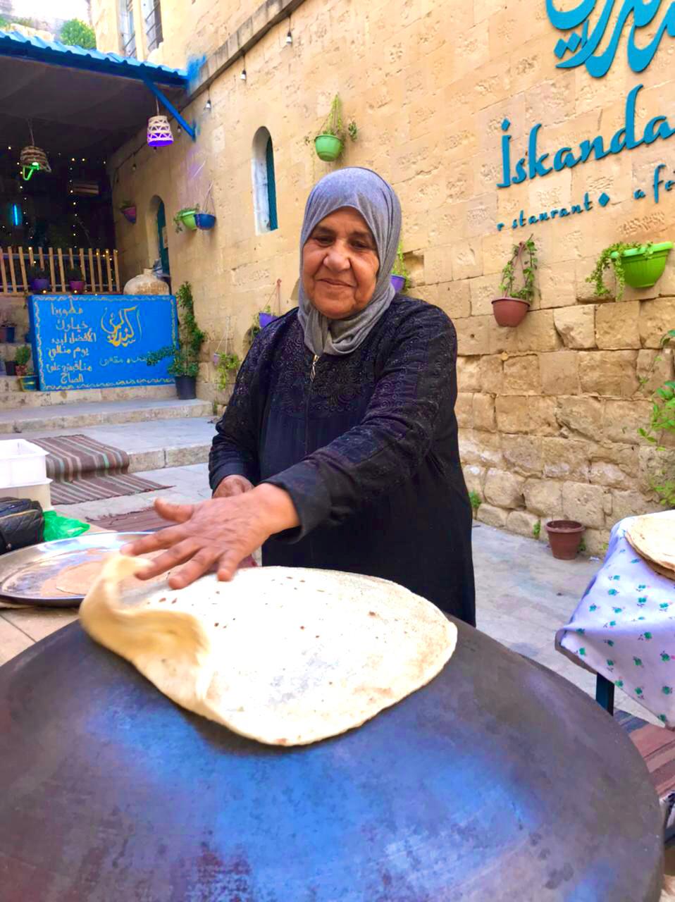 بين تلك الحجارة الصفراء التي تبلغ عدد من العقود تقطن حورية الشحادات المعروفة "بأم غازي" إلى جانب ذلك الفرن والصاج بعباءة سوداء تتناثر عليها نترات من القمح البني التي تعجن به مرارة تلك الأيام وبابتسامة تخالطها تجاعيد العمر تستقبل المارة وترحب بهم وفي احد الزوايا المخفية خلف عبائتها نجد أحد أحفادها الصغار الذي يصف نفسه بالمغوار الذي جاء ليساعد جدته في العمل .