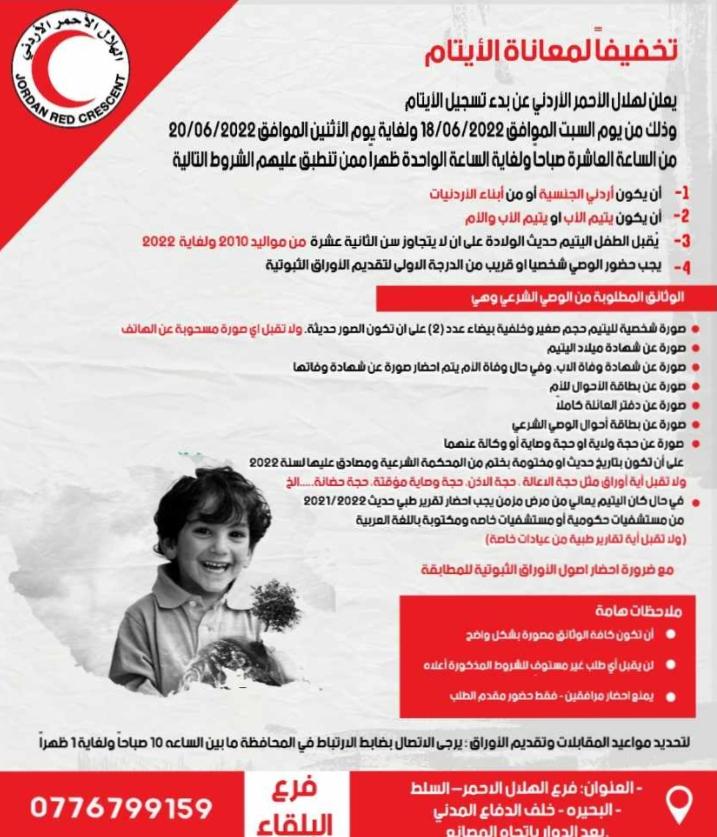تخفيفاً لمعاناة الأيتام، يعلن الهلال الأحمرالأردني عن بدء تسجيل الأيتام وذلك من يوم السبت الموافق 18/06/2022 ولغاية يوم الأثنين الموافق 20/06/2022 من الساعة العاشرة صباحاً ولغاية الساعة الواحدة ظهراً ممن تنطبق عليهم الشروط التالية :