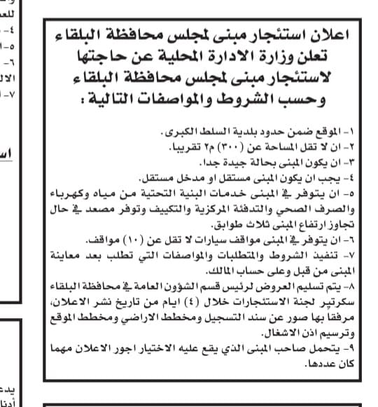 اعلن مجلس اللامركزية في محافظة البلقاء عن حاجته لأستئجار مبنى لمجلس المحافظة حسب الشروط والمواصفات التالية /