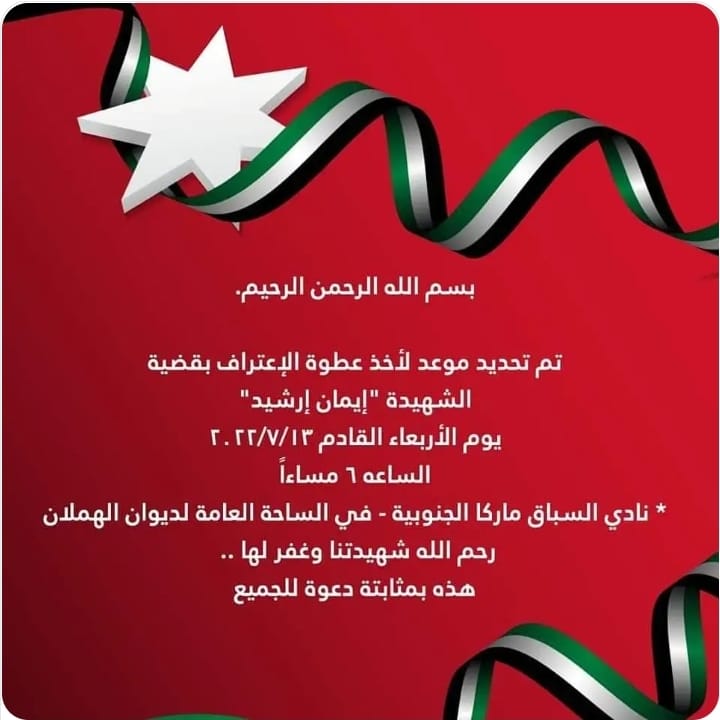 تم تحديد موعد لأخذ عطوة اعتراف بقضية الطالبة الجامعية المغدورة إيمان_ارشيد.