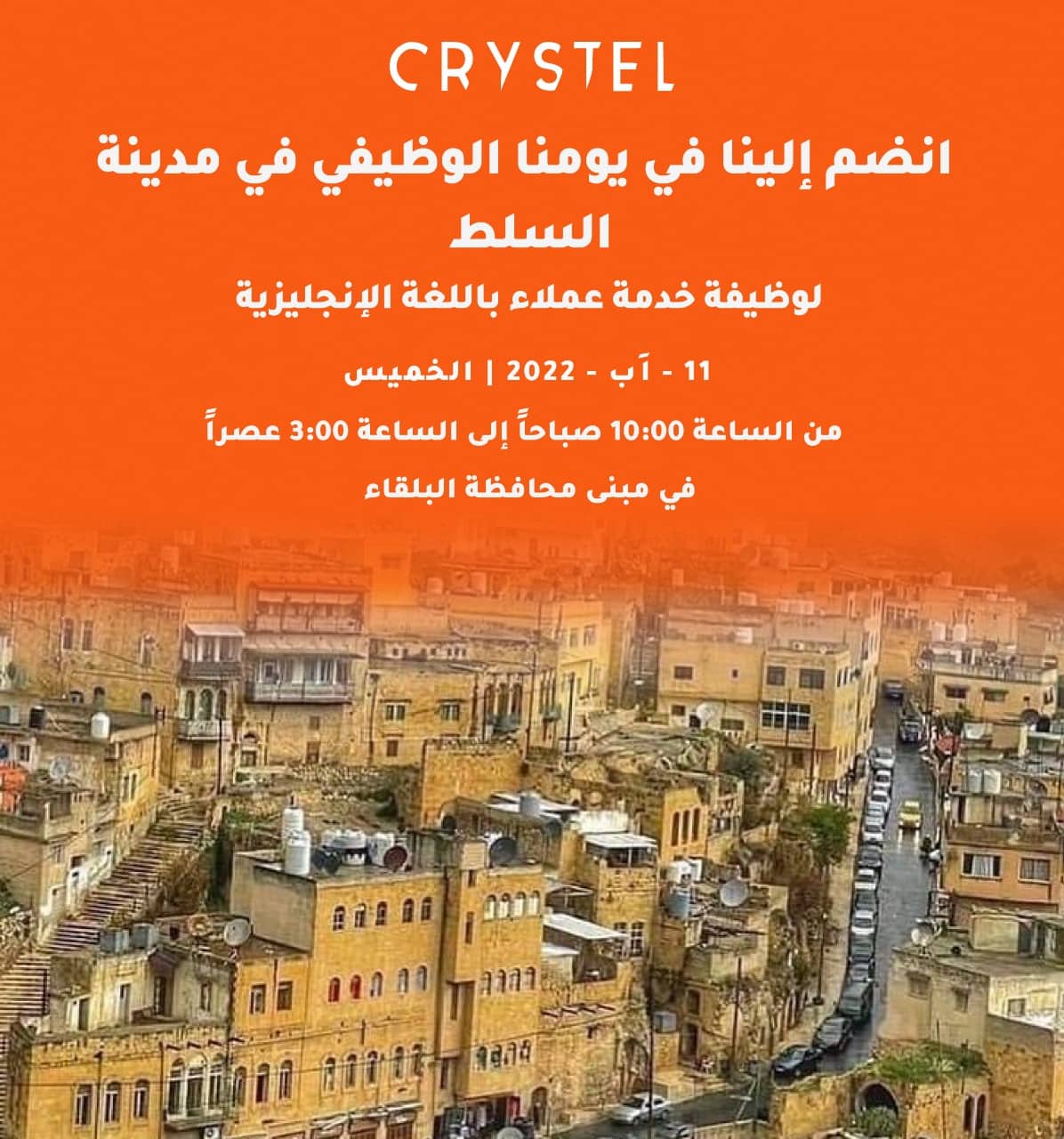 قال محافظ البلقاء الدكتور فراس ابو قاعود انه سيتم اقامة يوم وظيفي في مبنى محافظة البلقاء يوم الخميس الموافق 1182022 بالتعاون مع الشركه الدوليه لاعمال خدمة التواصل"كريستل" ،وبين ابو قاعود ان الاجتماع الذي عقده اليوم بمكتبه مع مدير عام الشركة يهدف لتشغيل 150 موظف من ابناء المحافظه من حمله درجه الدبلوم فما فوق على ان يتحدث اللغه الانجليزيه بطلاقه ،علما بان المقابله ستكون باللغه الانجليزيه الساعه العاشره صباحا .