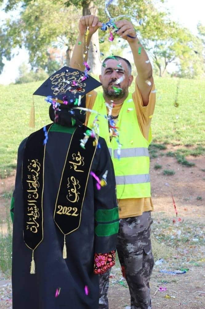 الناشط في مخيم البقعه محمود الشطرات الملقب العقيد ابو بشار يفرح لتخرج زوجته بلباس العمل علمآ انه يعمل عامل مياومه في وكالة الغوث لاكن أصراره واجتهاده فاقت كل التوقعات