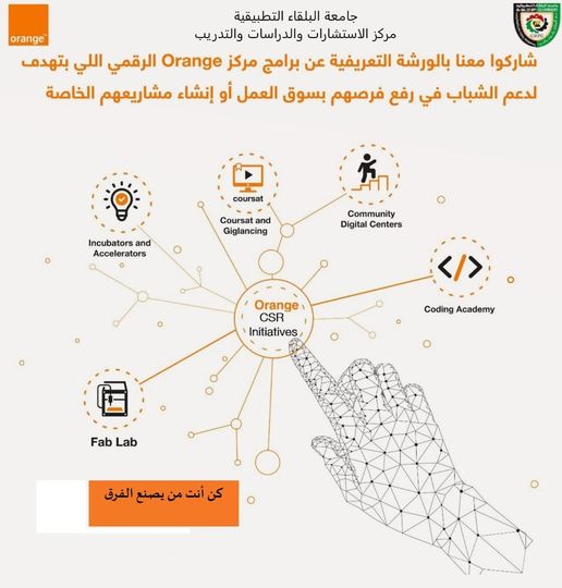 لشبابنا وشابّاتنا بالبلقاء.. وبدعم من الاتحاد الأوروبي يقيم مركز الاستشارات والدراسات والتدريب بالتعاون مع أكاديمية البرمجة من أورانج في لقاء خاص مع شباب وشابّات محافظة البلقاء