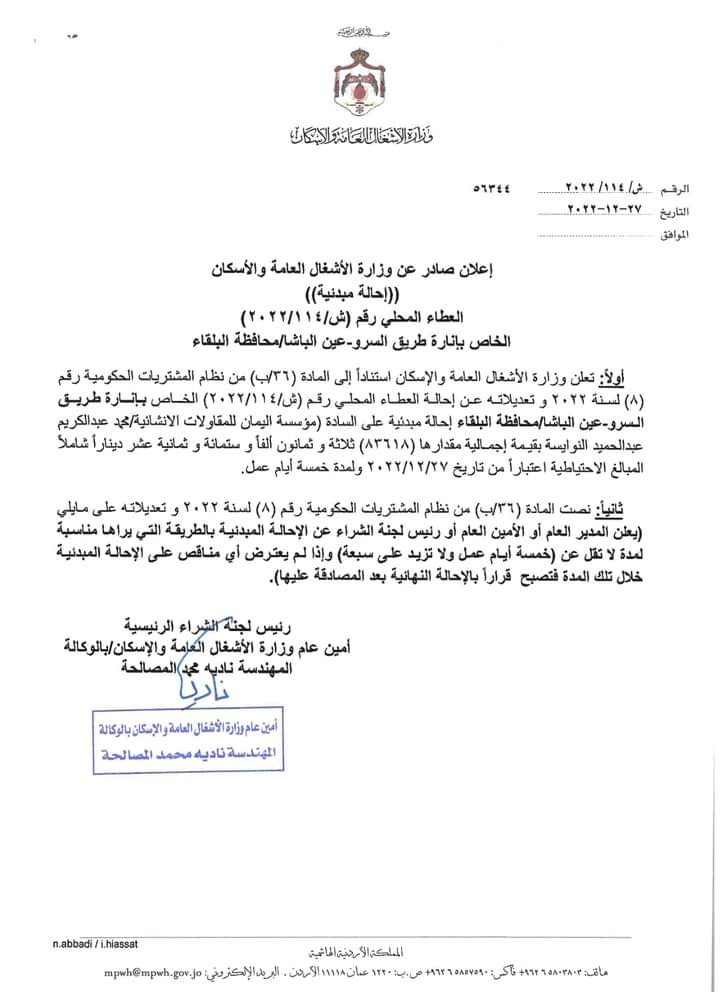 اعلنت وزارة الاشغال العامة والاسكان عن احالة عطاء طريق السرو / عين الباشا على احد المقاولين المحليين بكلفة اجمالية بلغت 83 الف دينار