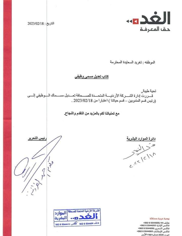 ترفيعها رئيس قسم المندوبين " قسم حياتنا " في صحيفة الغد الغراء