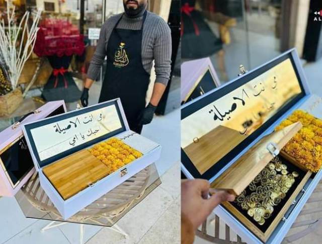 وقد قام بتجهيز الهدية وتنسيقها وهي عبارة عن باقة من الورود ومصحف وما يقرب من 110 قطع نقدية من الذهب.