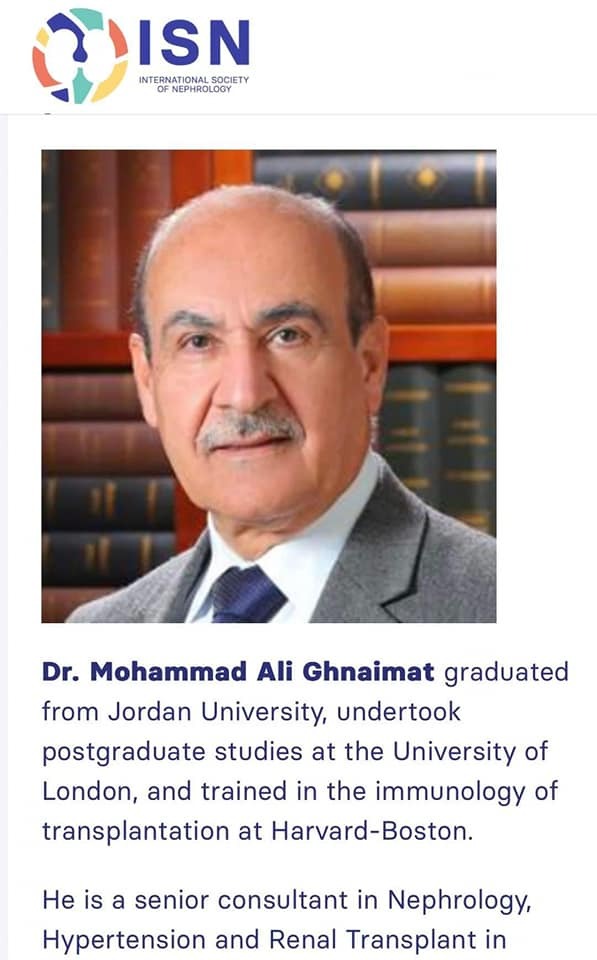 فاز الاستاذ الدكتور محمد علي غنيمات بجائزة الطبيب المتميز في أمراض وزرع الكلى عن منطقة الشرق الأوسط (ISN Pioneer Award)وأحد الأطباء الروّاد المميزين على مستوى العالم.