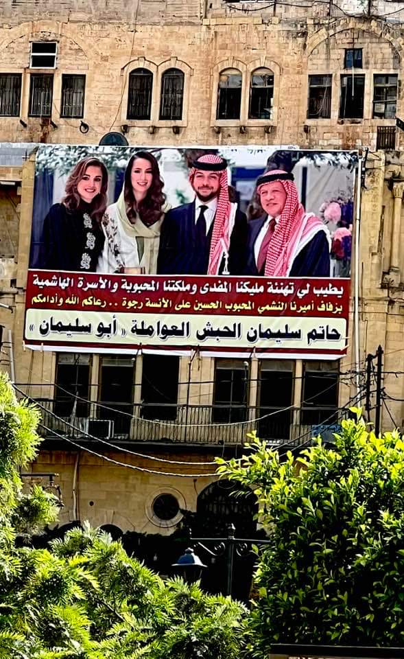 رفع المواطن حاتم سليمان الحبش العواملة اكبر لافته في مدينة السلط مهنئا فيها الملك عبد الله الثاني بن الحسين وجلالة الملكة بمناسبة زفاف الامير المحبوب الحسين بن عبد الله على الانسة رجوة ....