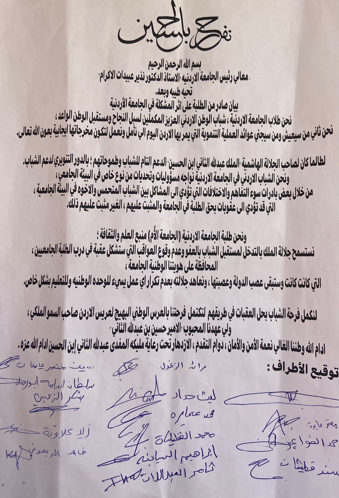 طلاب الاردنية يلتمسون الصفح عنهم اثر المشكلة الطلابية بمناسبة افراح المملكة بزفاف ولي العهد