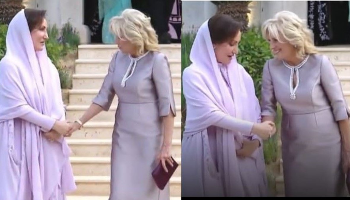 البلقاء اليوم - إطلالة السيّدة عزّة السديري والدة العروس رجوة الحسين في فستان من تصميم جورج حبيقة وتبدو السيّدة الأميركيّة الأولى جيل بايدن بجانبها