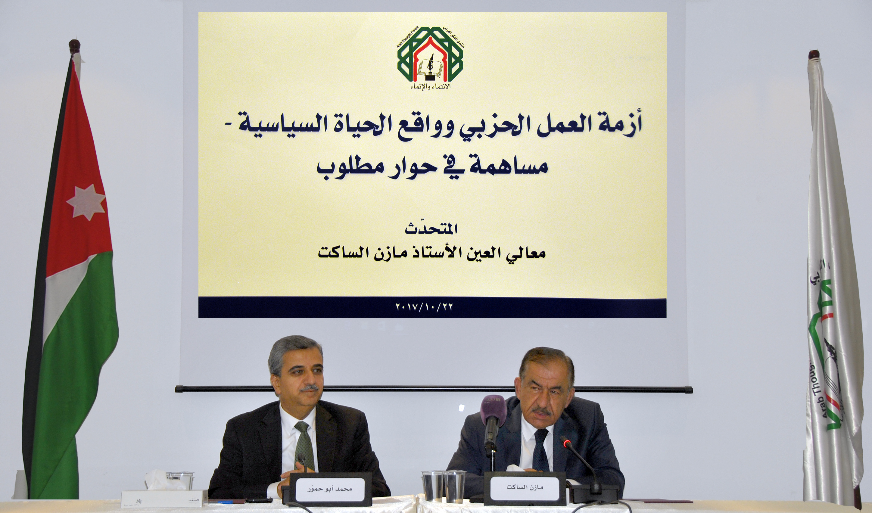 استضاف منتدى الفكر العربي في لقائه مساء الأحد 22/10/2017 الوزير السابق والعين الأستاذ مازن الساكت في محاضرة بعنوان 'أزمة العمل الحزبي وواقع الحياة السياسية – مساهمة في حوار مطلوب'، تناول فيها معوقات الممارسة الحزبية انطلاقاً من مفهوم أن الحياة السياسية هي تعبير شامل عن واقع العمل السياسي في المجتمع ومؤسساته وتمثله من خلال السلطتين التشريعية والتنفيذية، وفي ضوء التطورات الدولية والإقليمية وانعكاساتها على الإيديولوجيات والبرامج وواقع القوى والأحزاب والحياة السياسية بشكل عام.