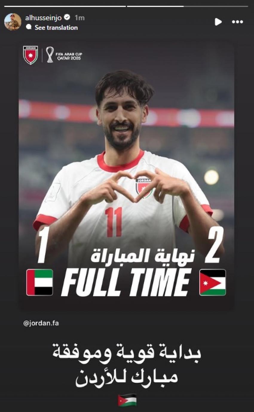 هنأ سمو ولي العهد الأمير الحسين بن عبدﷲ الثاني، منتخبنا الوطني بعد فوزه في افتتاح مشواره ببطولة كأس العرب 2025.ونشر سموه، عبر حسابه في أنستغرام:...